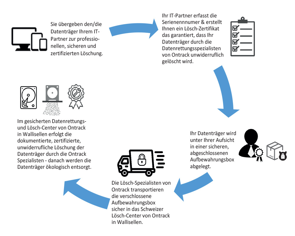 Hierfür bietet Ontrack mit einem Schweizer Netzwerk an regionalen Lösch-Partnern einen standardisierten Datenlösch-Service für die zuverlässige Löschung digitaler Daten ab jedem digitalen Datenträger.